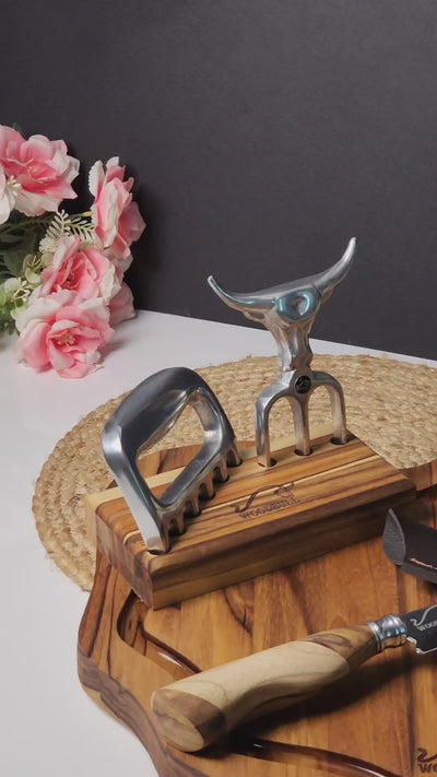 - Acompanha um suporte com um garfo e uma garra em alumínio polido.